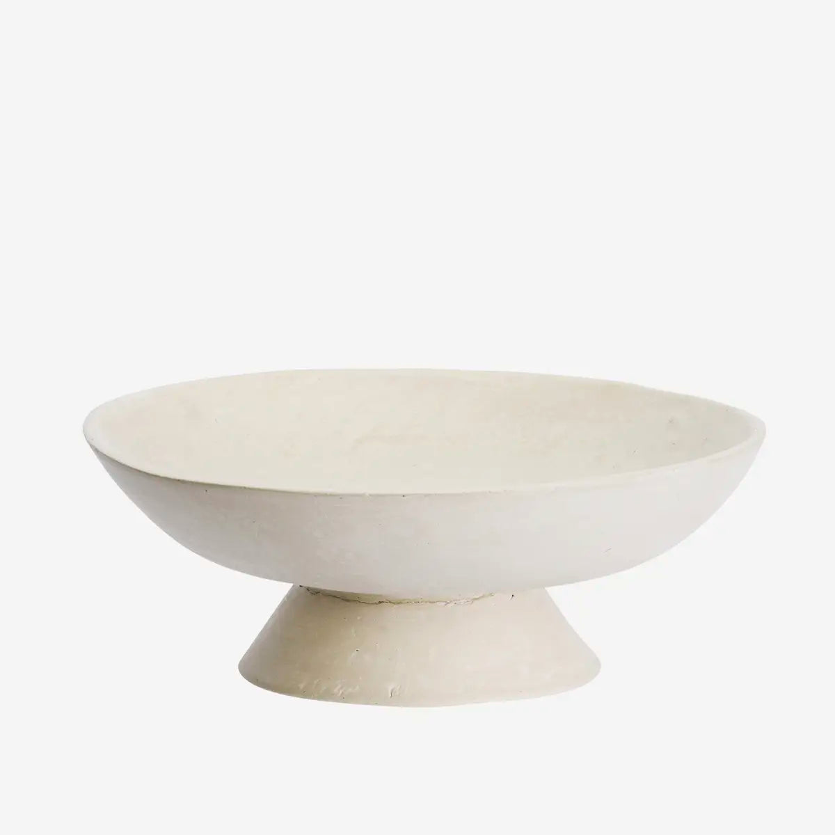 Ce bol de piédestal met en valeur l'artisanat durable de l'Inde, composé à 60 % de journaux recyclés et de 40 % de craie, relié avec de la résine d'arbre. Sa couleur blanche naturelle et sa surface mate et irisée reflètent magnifiquement la lumière, adaptée à la décoration ou comme bol de fruits. Chaque pièce est faite à la main, ce qui garantit des variations uniques sans produits chimiques ni colorants.